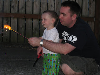He was consoled after a good hard cry but was now determined NOT to do any sparklers. So being the mean mom I am, I coerced him into standing next to me while I held the sparklers. But you can see how much fun he's having.